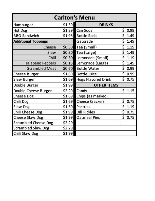 The menu's simplicity doesn’t compromise its quality, as each item delivers a satisfying experience. Whether you're stopping by for a quick meal or enjoying a relaxing lunch, Carlton's Hamburgers & Hotdogs offers a selection that caters to all tastes.
